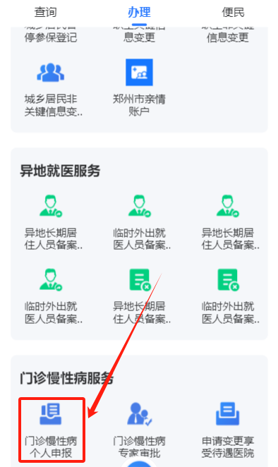 亲属代办:在“门诊慢性病服务”一栏选择“门诊慢性病亲属代申报”即可。