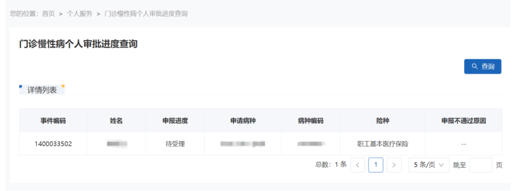 门诊慢性病个人审批进度查询(电脑端)进入后显示患者申请的各个慢性病当前状态。