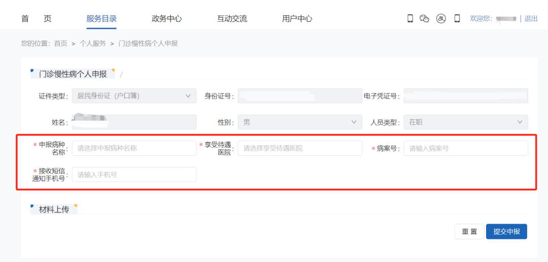 依次选择申报病种、享受待遇医院、病案号(一般在患者住院病案首页右上角位置)、移动电话。