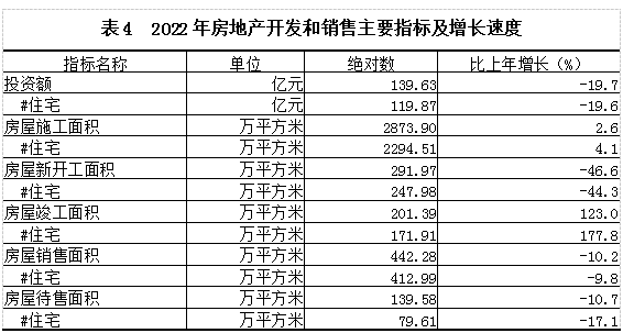 全年房地产开发投资139.63亿元,比上年下降19.7%;其中,住宅投资119.87亿元,下降19.6%。商品房销售面积442.28万平方米,下降10.2%,其中,商品住宅412.99万平方米,下降9.8%。