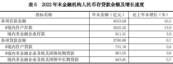 年末全市金融机构人民币各项存款余额4053.68亿元,比上年末增长10.5%,其中境内住户存款余额2925.22亿元,增长13.9 %;人民币各项贷款余额2786.89亿元,增长6.1%,其中境内住户贷款余额731.18亿元,增长5.9%。