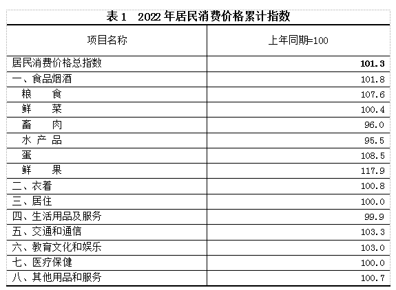 全年居民消费价格比上年上涨1.3%。其中:食品烟酒类比上年上涨1.8%,教育文化和娱乐类上涨3.0%。