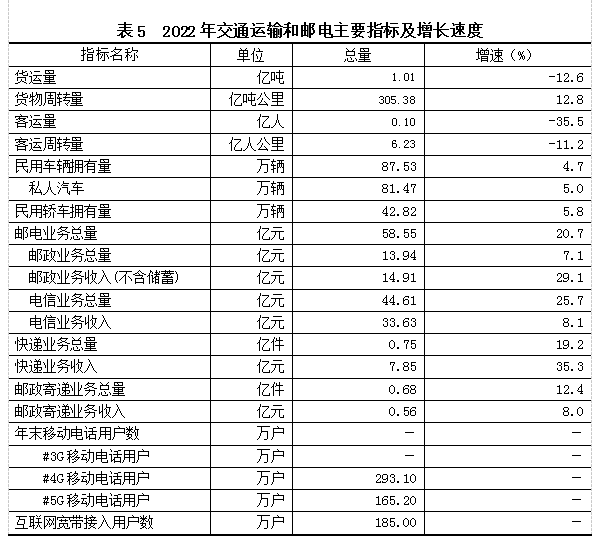 全年邮电业务总量58.55亿元,比上年增长20.7%。其中,邮政行业业务总量(含快递)13.94亿元,增长7.1%;电信业务总量44.61亿元,增长25.7%。快递业务总量0.75亿件,增长19.2%;快递业务收入7.85亿元,增长35.3%。年末互联网用户185万户,1000M以上宽带用户占比为22.7%。