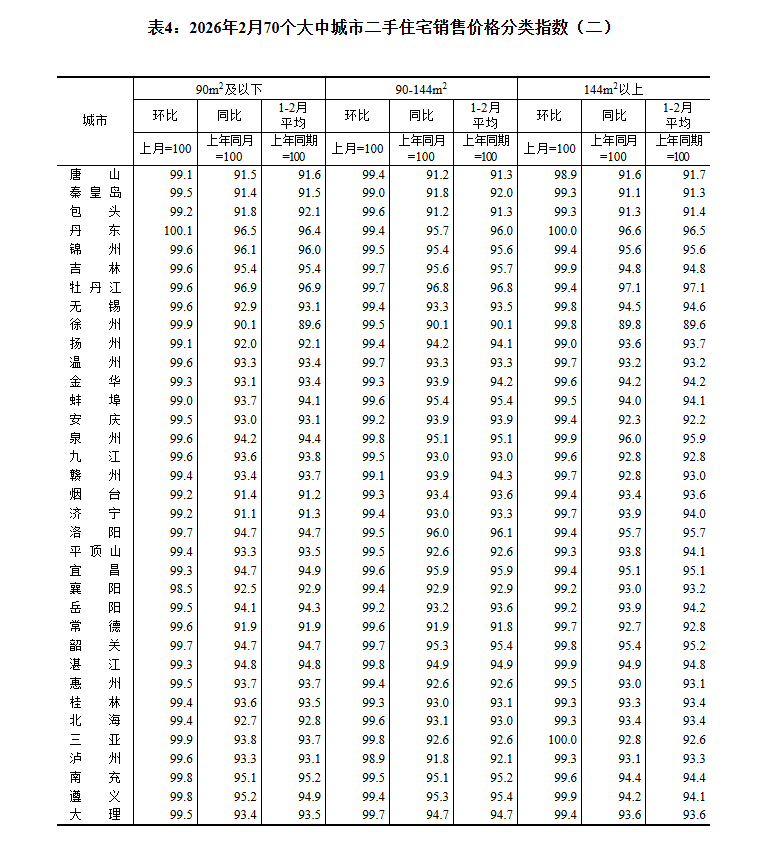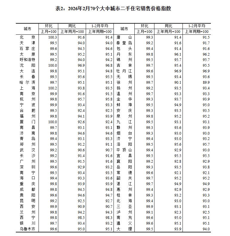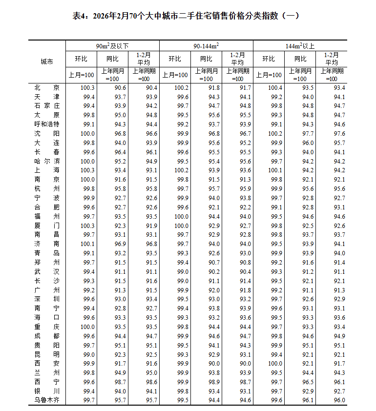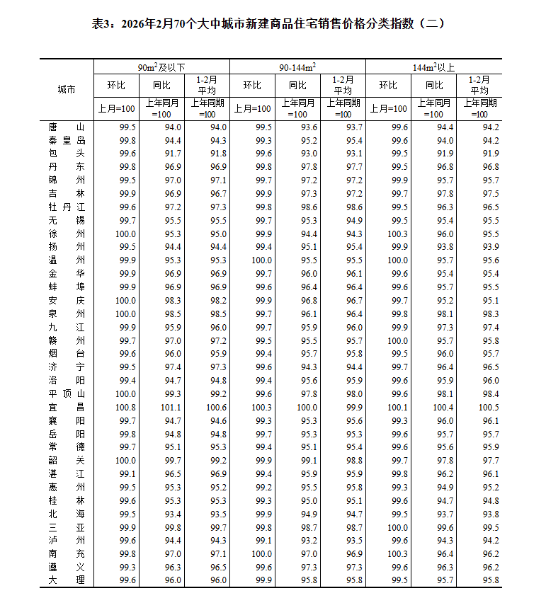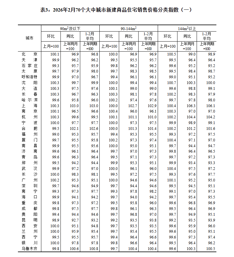 5.按照统计制度规定,2026年1月起,70个大中城市房地产价格统计调查开始使用2025年作为新一轮对比基期,各城市基本分类权数有所调整,以更好反映住宅销售结构变动。经测算,本次基期轮换对70个大中城市商品住宅销售价格各月同比指数影响平均在0.03个百分点以内。